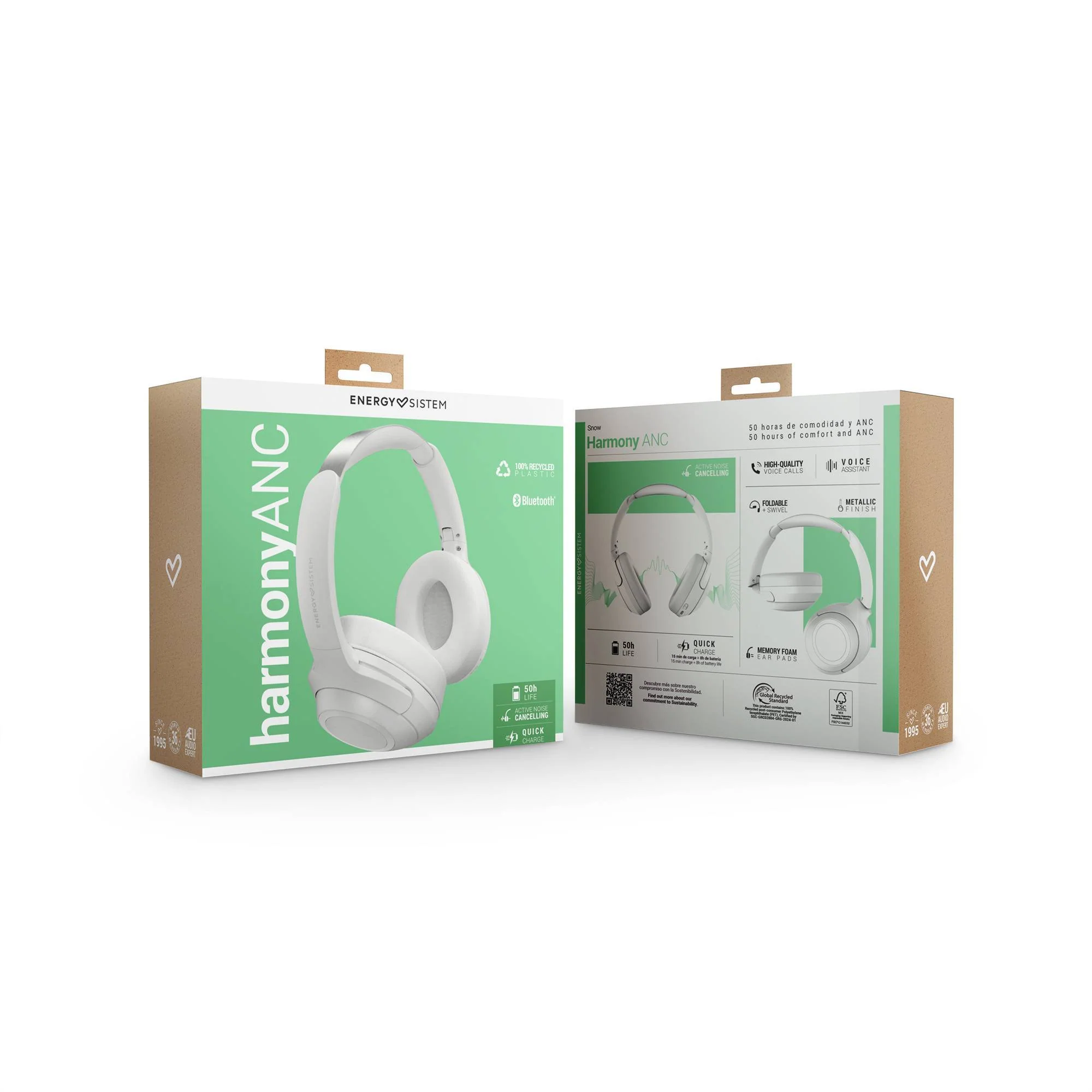 Bluetooth headphones with Active Noise Cancelling technology made from recycled plastic. 50 hours of battery life, an ambient noise cancelling (ENC) microphone for crystal-clear calls, and superior style and comfort thanks to their foldable metal headband and protein leather ear cushions.