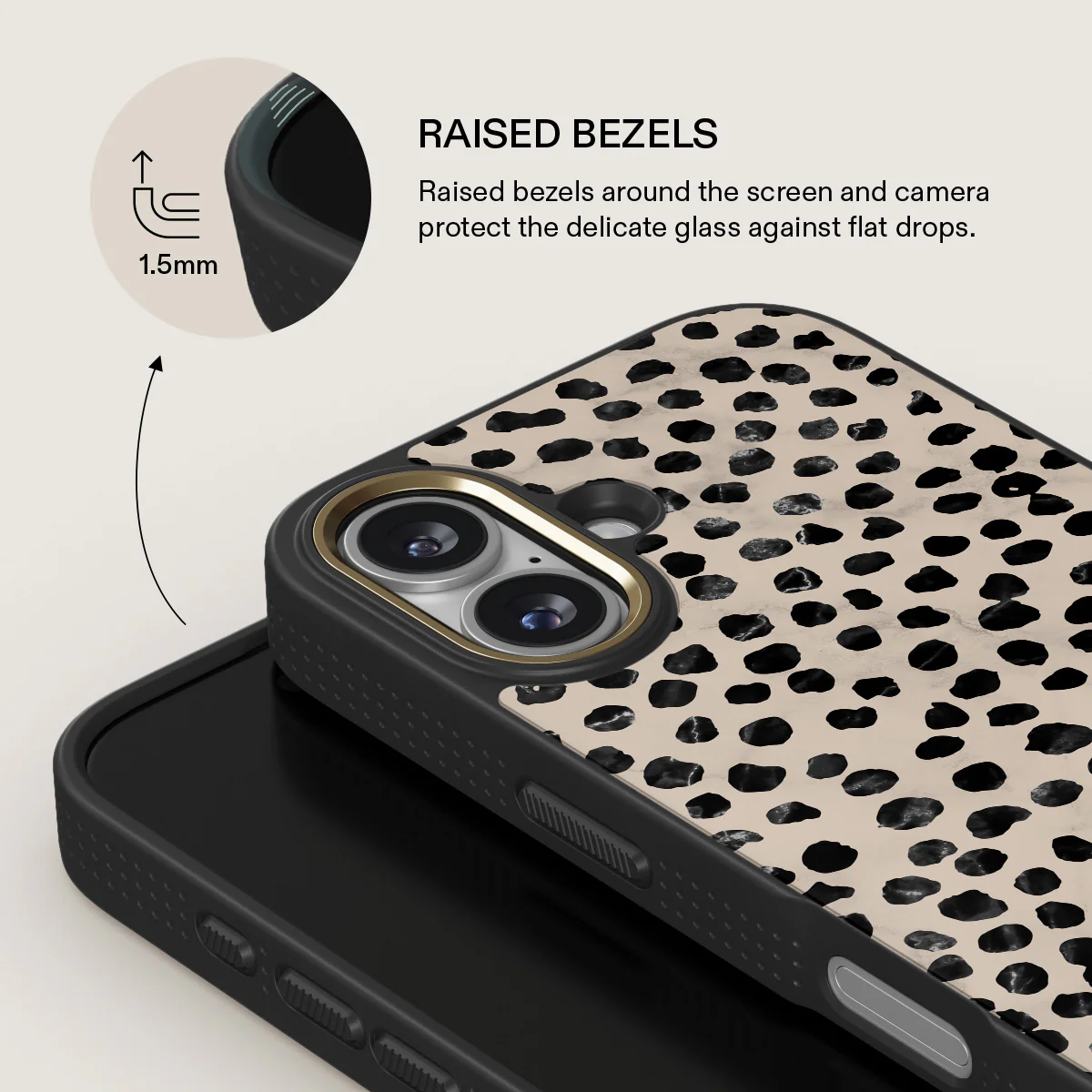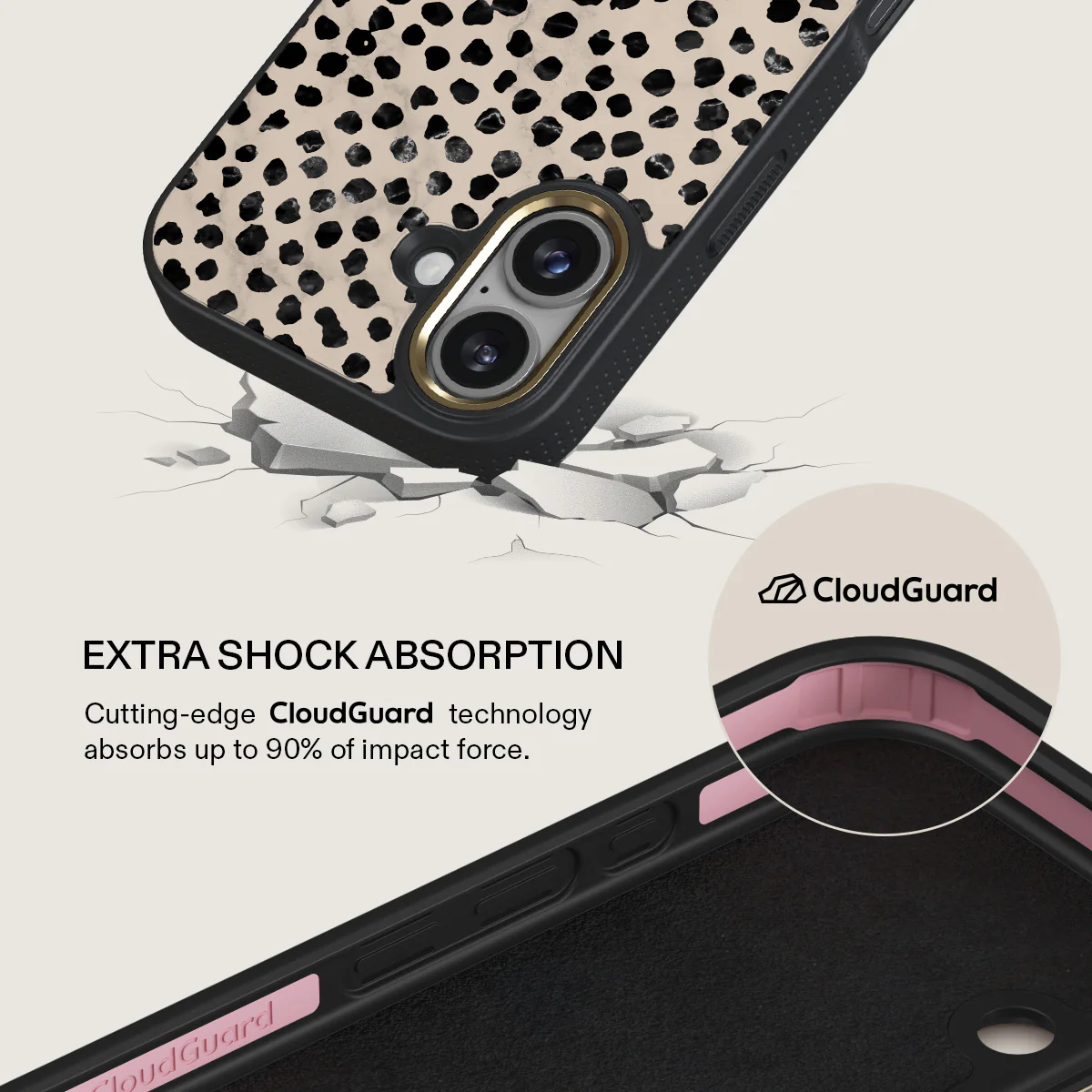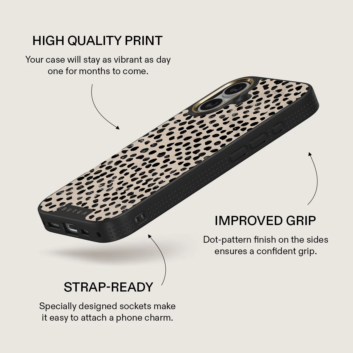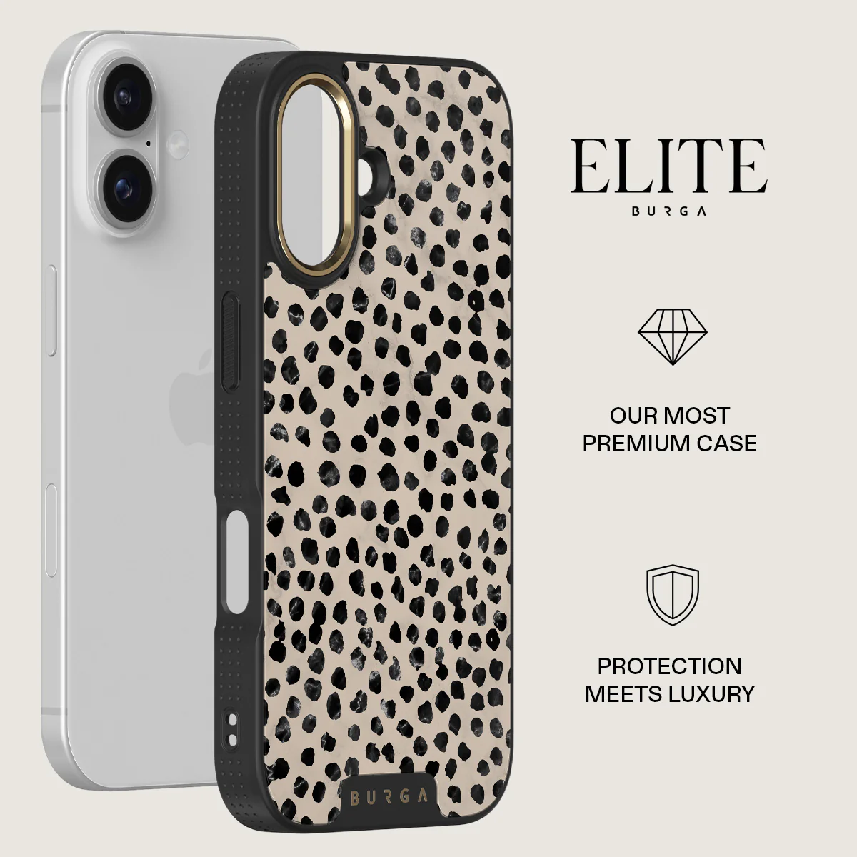 Cute cream color as a background for the unique pattern of asymmetrical black spots creates a real eye-catcher in our Almond Latte iPhone 17 phone case. The spotted pattern adds a touch of luxury to your phone, while the case's hard-shell nature offers much-needed protection making it a popular choice between fashion lovers.